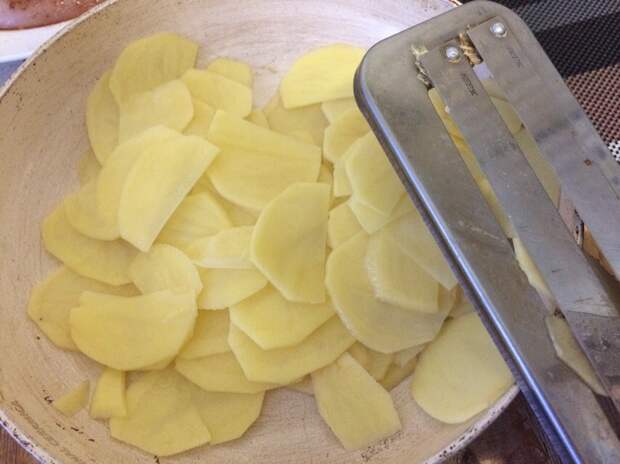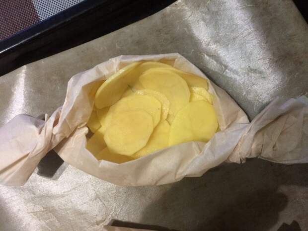 - Из пергамента делаем лодочку, скрутив концы. На дно по бокам – выкладываем картофель.