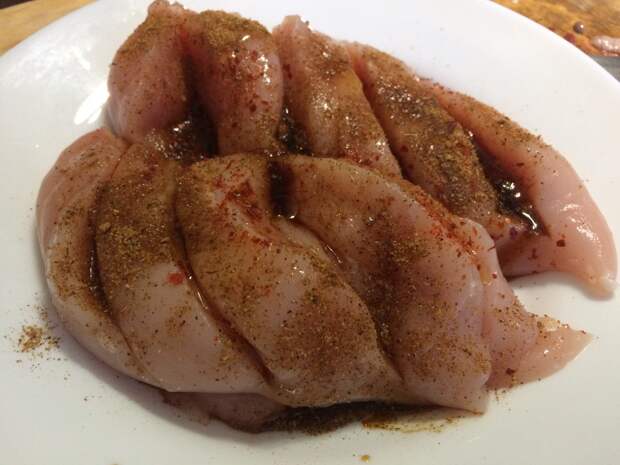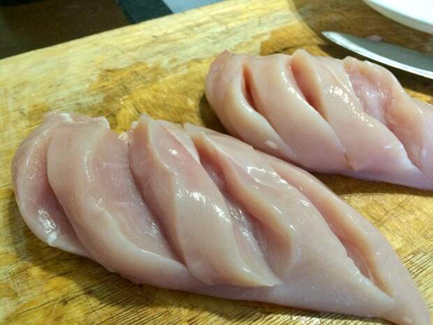 - На курином филе делаем глубокие, но не насквозь, косые надрезы.