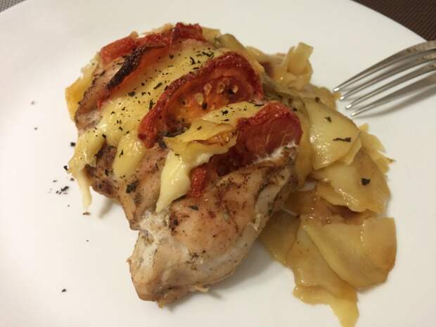 - На картофель кладём куриное филе, начинённое кусочками томата и сыра.