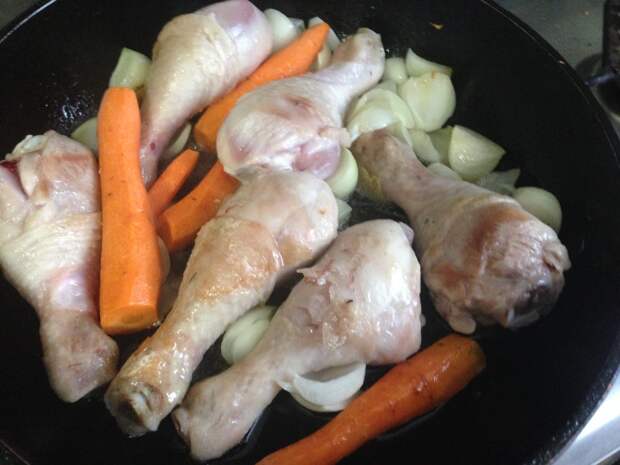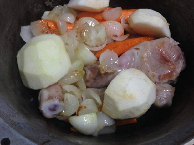 - Голень, очищенную морковь, и четвертинки лука слегка поджариваем на сливочном масле.