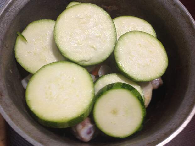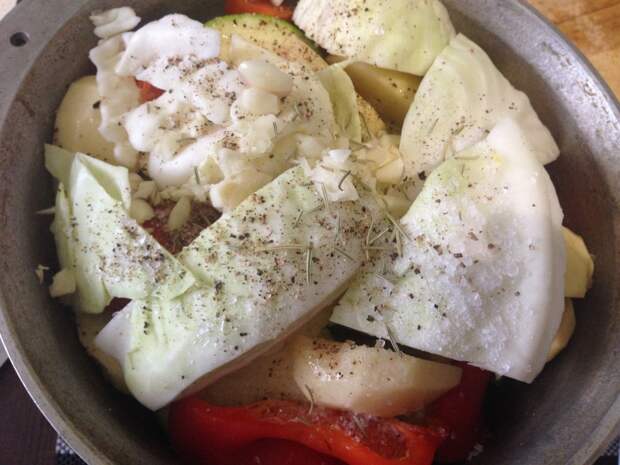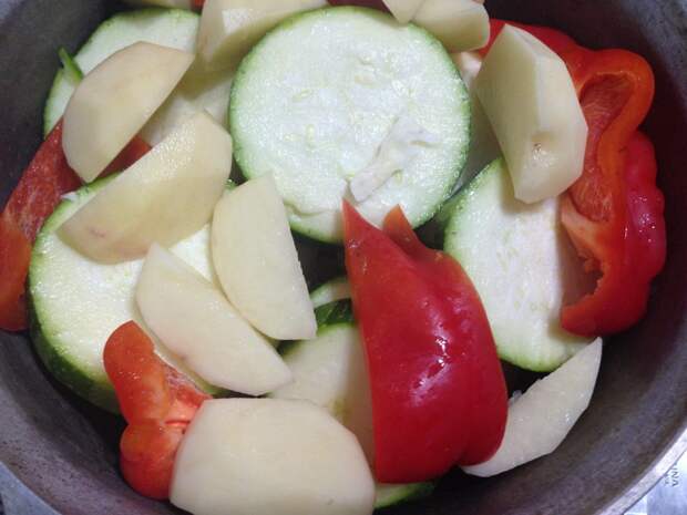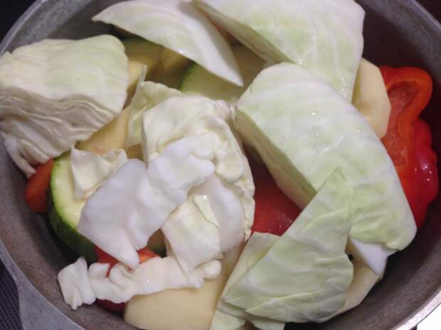 - Затем выкладываем остальные овощи в любом порядке – кружочки молодого кабачка, четвертинки картошки, нарезанный сладкий перец и крупные куски капусты.