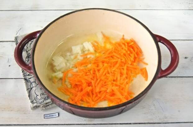В чугунной латке с небольшим количеством растительного масла обжарить рубленый лук и тертую морковь до мягкости.
