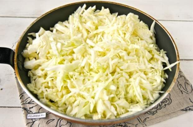Капусту нашинковать и обжарить на сковороде с растительным маслом до мягкости на среднем огне. Если капуста станет пригорать, нужно добавить немного воды.