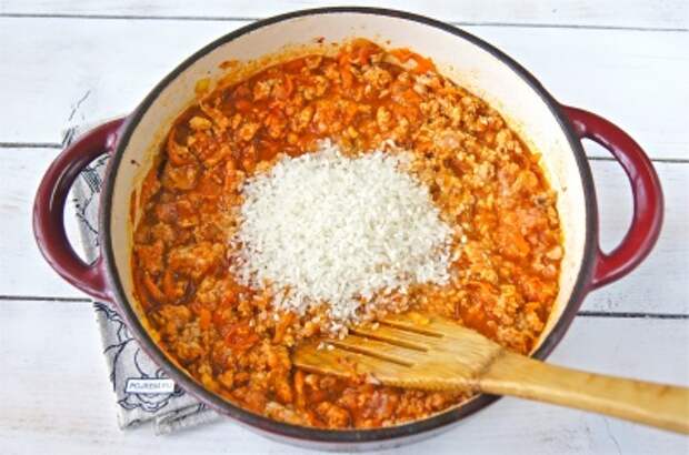 Добавить рис, перемешать и влить 1,5 стакана воды, прикрыть крышкой и тушить на слабом огне минут 20-25.