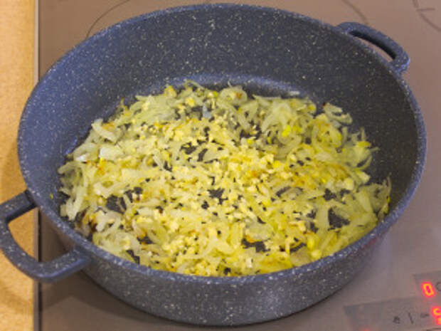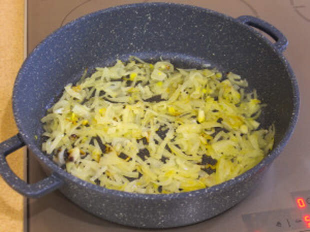 На растительном масле обжарить лук.