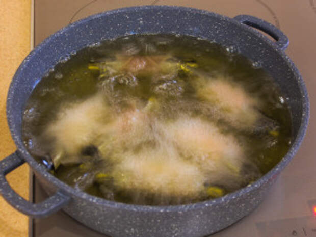 Чтобы проверить, достаточно ли разогрелось масло, можно опустить в него маленький кусочек теста. Если оно начинает пузыриться, масло разогрето.