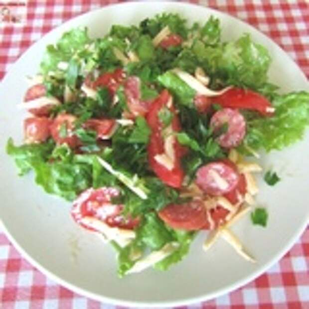 Смешать все ингредиенты в салатнике. Посолить, поперчить, заправить оливковым маслом. Сверху присыпать зеленью петрушки. Салат с сыром и охотничьими колбасками готов! Подробный процесс приготовления смотрите на видео. Приятного аппетита! Загрузка...
