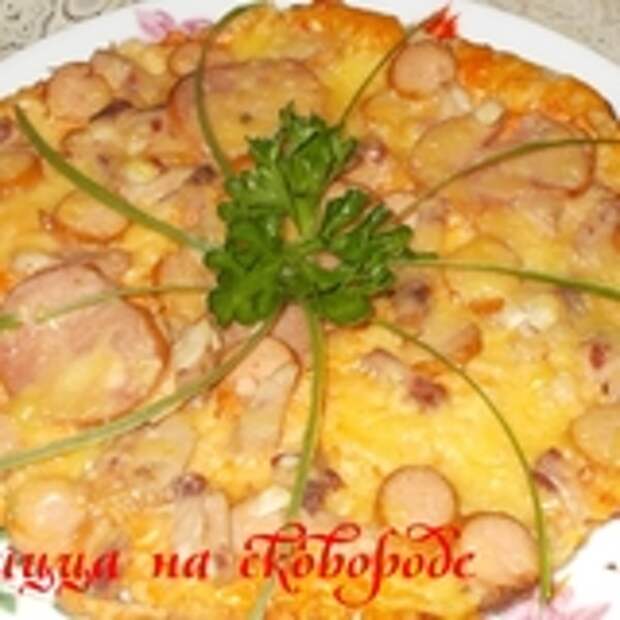 Раскатать тесто и положить на сковороду ,смазанную растительным маслом ,положить майонез и кетчуп -затем положить сосиски и колбасу, посыпать сыром , закрыть крышкой сковороду