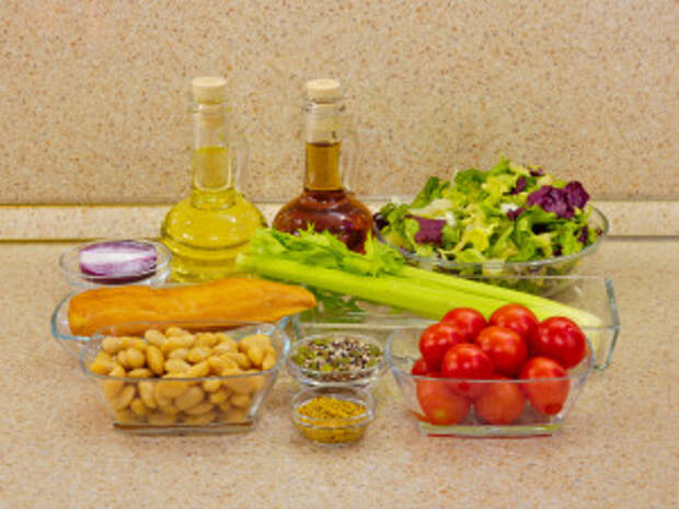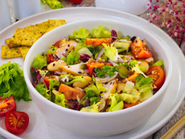 Смешать салат, филе, фасоль, сельдерей, помидоры, лук.