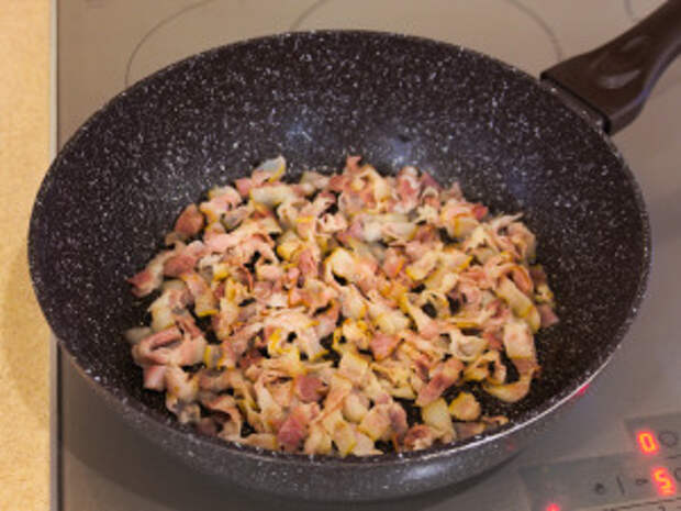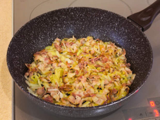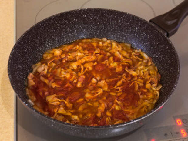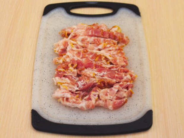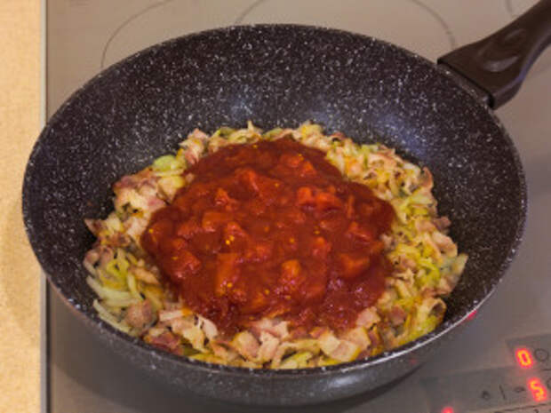 Выложить бекон с томатами в форму для запекания (у меня форма 20×30 см).