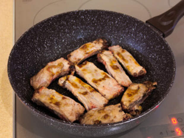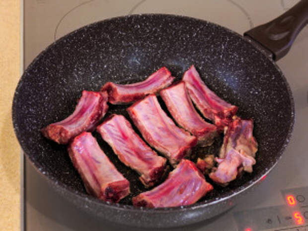 На сковороде (без добавления масла) обжарить ребрышки с одной стороны.
