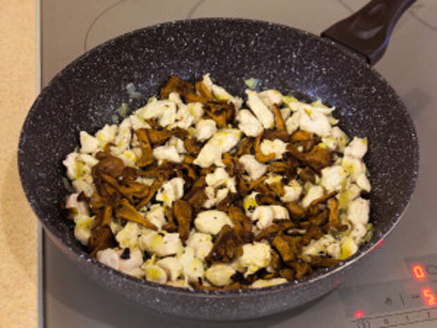 Замороженные грибы тоже надо отварить.Из указанного количества ингредиентов получается 4–5 порций.