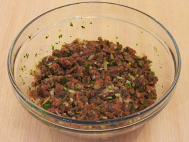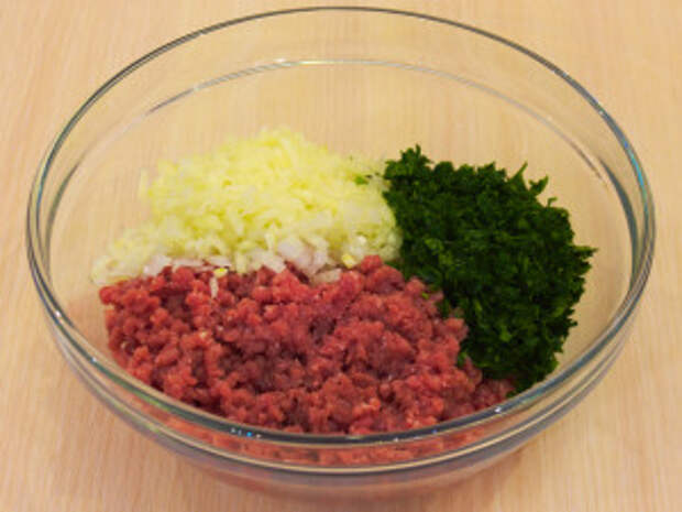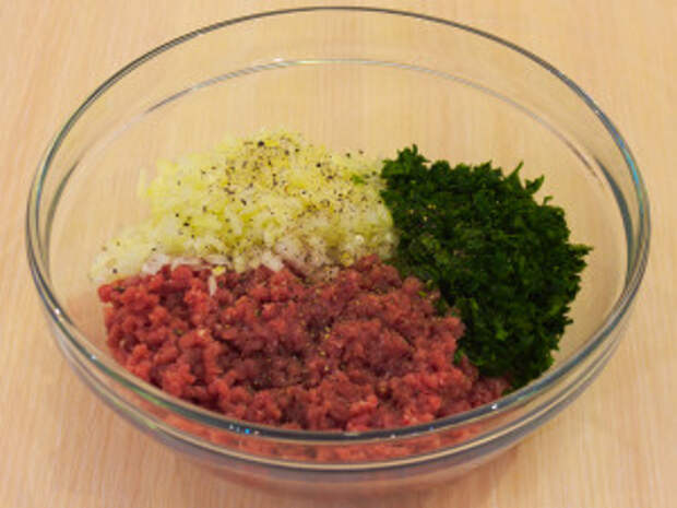 К фаршу добавить лук, зелень.