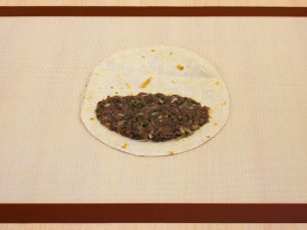 На одну половину выложить фарш, отступив от края 2–2.5 см.
