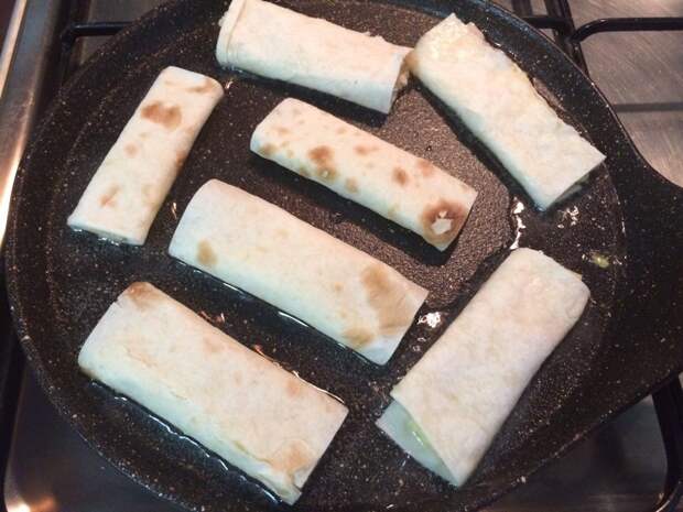 4. Подготовленные изделия (швом вниз) выкладываем на разогретую блинную сковороду. Предварительно смазываем сковороду растительным маслом. Поджариваем с обеих сторон до хрустящей румяной корочки.