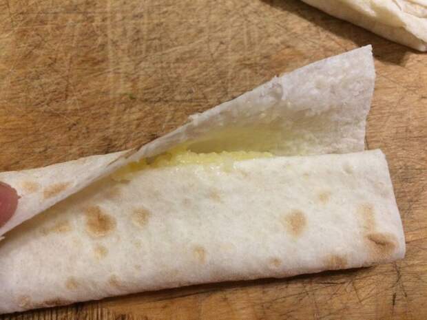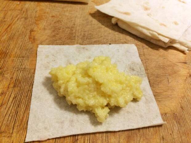 2. Лаваш нарезаем на квадраты. По размеру они могут быть разными – маленькими, средними или большими. Как вы пожелаете! В центр кладем пшённую кашу.