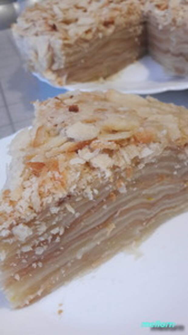 1 часть раскатать в круг. Круг наколоть вилкой, чтобы сильно не пузырился при выпечке. Готовый корж вырезать по размеру формы, в которой будет собираться торт. Обрезки раскрошить.